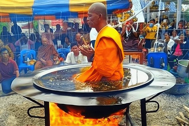 其实在泰国这些僧人的地位非常的高,也是普遍受人们尊敬的。很多的人在见到他们的时候,也都会致以崇高的敬意,而在这其中有很多的高僧为了推广佛法,也会去到街头表演,其中最为神奇的就是表演“下油锅”了。